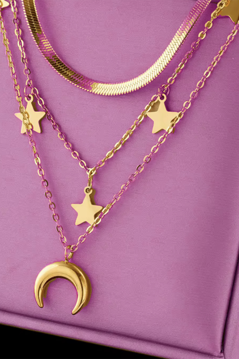 Μοντέρνο κολιέ με τριπλή αλυσίδα και κρεμαστά φεγγάρι και αστέρια. Από επιχρυσωμένο ατσάλι με χρυσό 18k και ενιαίο κούμπωμα. Ιδανικό για special εμφανίσεις